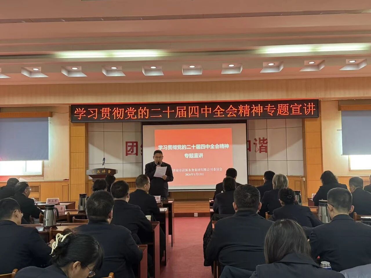 ? ? ? ?1月13日,濟(jì)南市清源水務(wù)集團(tuán)有限公司黨委組織學(xué)習(xí)貫徹黨的二十屆四中全會(huì)精神專題宣講。黨委書記、董事長(zhǎng)魏長(zhǎng)學(xué)作宣講報(bào)告,黨委副書記、董事、總經(jīng)理金強(qiáng)主持會(huì)議,集團(tuán)公司領(lǐng)導(dǎo)、各職能部室主要負(fù)責(zé)人及各黨支部書記、支委成員、黨員、入黨積極分子、群眾、統(tǒng)戰(zhàn)對(duì)象代表參加學(xué)習(xí)。